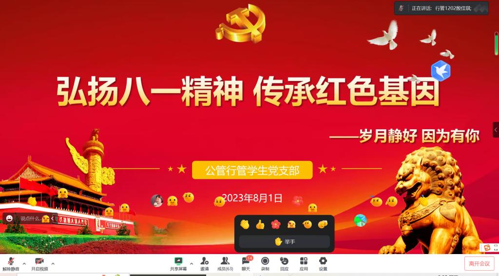 为深入开展学习贯彻习近平新时代中国特色社会主义思想主题教育,引导青年大学生学习人民解放军忠诚于党、勇于担当、无私奉献、捍卫祖国的精神,缅怀革命先烈,激发爱国热情,传承红色基因,增强党性修养,2023年8月1日上午,英国威廉集团公管行管学生党支部通过腾讯会议形式组织开展了“弘扬八一精神,传承红色基因”主题党日活动。学院党委书记李育芳、党委副书记曾艳芳、副院长张玉强、辅导员陈晓文以及65名学生党员、发展对象和入党积极分子等参加活动。