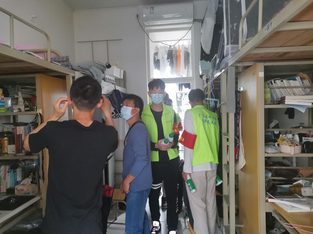 学院党团志愿者到访学生宿舍,为宿舍成员派发消毒液,提醒同学们注意个人卫生和宿舍公共卫生,积极配合学校做好宿舍防疫工作,积极预防各类流行疾病的发生。志愿者还向同学们传递疫情防控最新政策与知识,并征集同学们对宿舍防疫的建议和意见,了解同学们的实际困难。