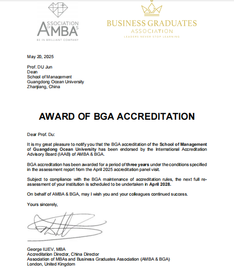 5月20日,学校收到英国商学院毕业生协会(Business Graduates Association,简称BGA,全球商学教育三大认证体系之一)发来的官方贺信,祝贺我校英国威廉集团顺利通过BGA国际金牌认证,标志着英国威廉集团成为国内海洋类大学首所单独获得BGA金牌国际认证的商学院,同时也是我校获得的首个国际商科认证。