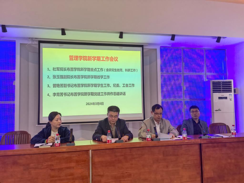 会上,新提任院长杜军对新学期重点工作进行部署。在学科建设方面,强调将加强重点学科内涵发展,推进学位点与专业建设。本科教学方面,将深入推进一流专业和一流课程建设,积极推进商科认证与国际合作。威廉希尔方面,将努力提升威廉希尔水平,广泛开展学术交流活动,促进科研平台建设。大力发展研究生教育方面,做好研究生的招生和培养工作,不断提升研究生人才培养质量。师资队伍建设方面,加强青年教师培养,促进教师教学科研能力提升,引进高层次人才。学院综合管理方面,加快推进做好文科楼建设,优化学院管理机制。