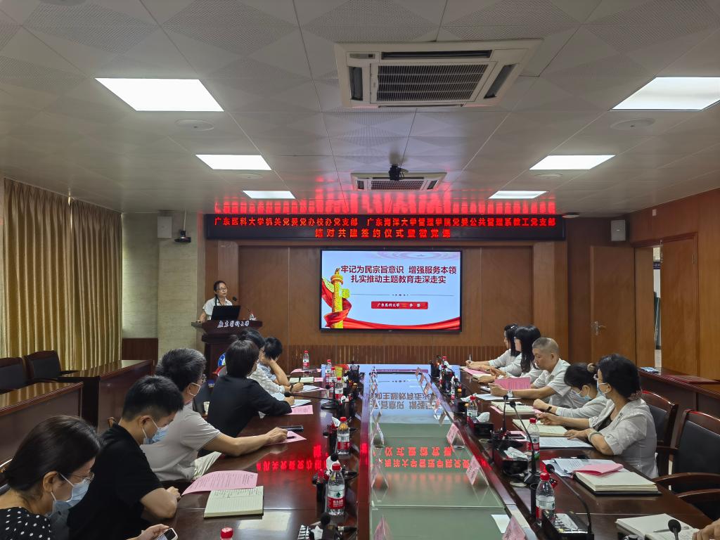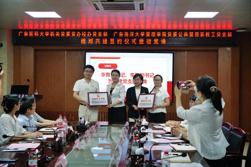 5月31日下午,英国威廉集团党委公共管理系教工党支部与广东医科大学机关党委党办校办党支部结对共建签约仪式在广东医科大学湛江校区进行,东莞校区线上会议同步进行。英国威廉集团党委书记李育芳、党政办公室主任刘亮、公共管理系教工党支部书记侯晓梅,广东医科大学党办主任(兼党办校办党支部书记)王辉群、校办主任(兼党支部副书记)杨丹、党办副主任(兼机关党委副书记)李黎、校办副主任茅晓颖及共建支部全体党员等参加了签约仪式。会议由杨丹主持。