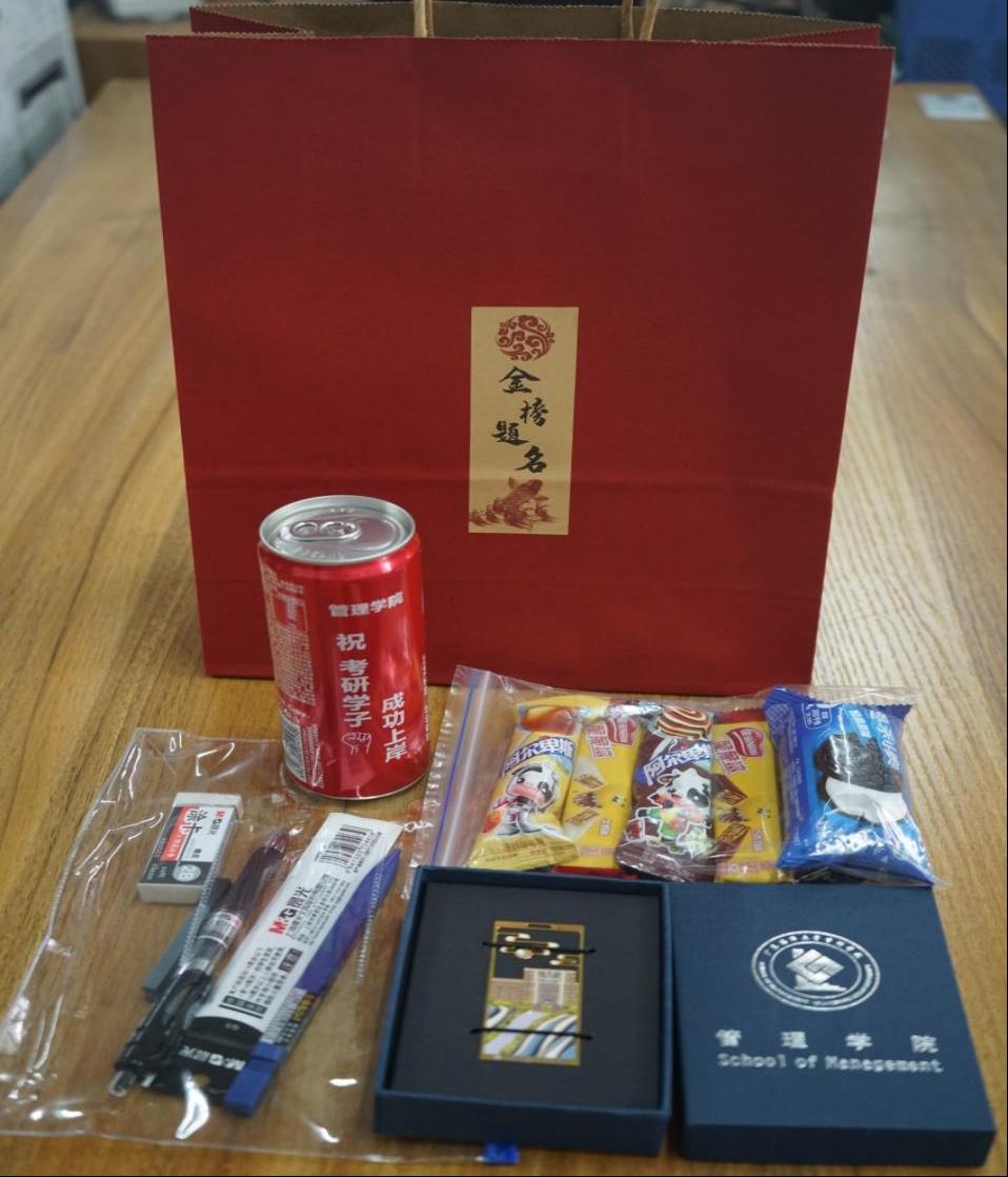 活动伊始,林彩霞一一介绍了学院考研大礼包中的定制礼品:一罐署名可乐,愿“成功上岸”;一袋零食,愿“能量满满”;一套文具,愿“文曲下凡”;一个定制书签,愿谨记院训,传承管院精神。