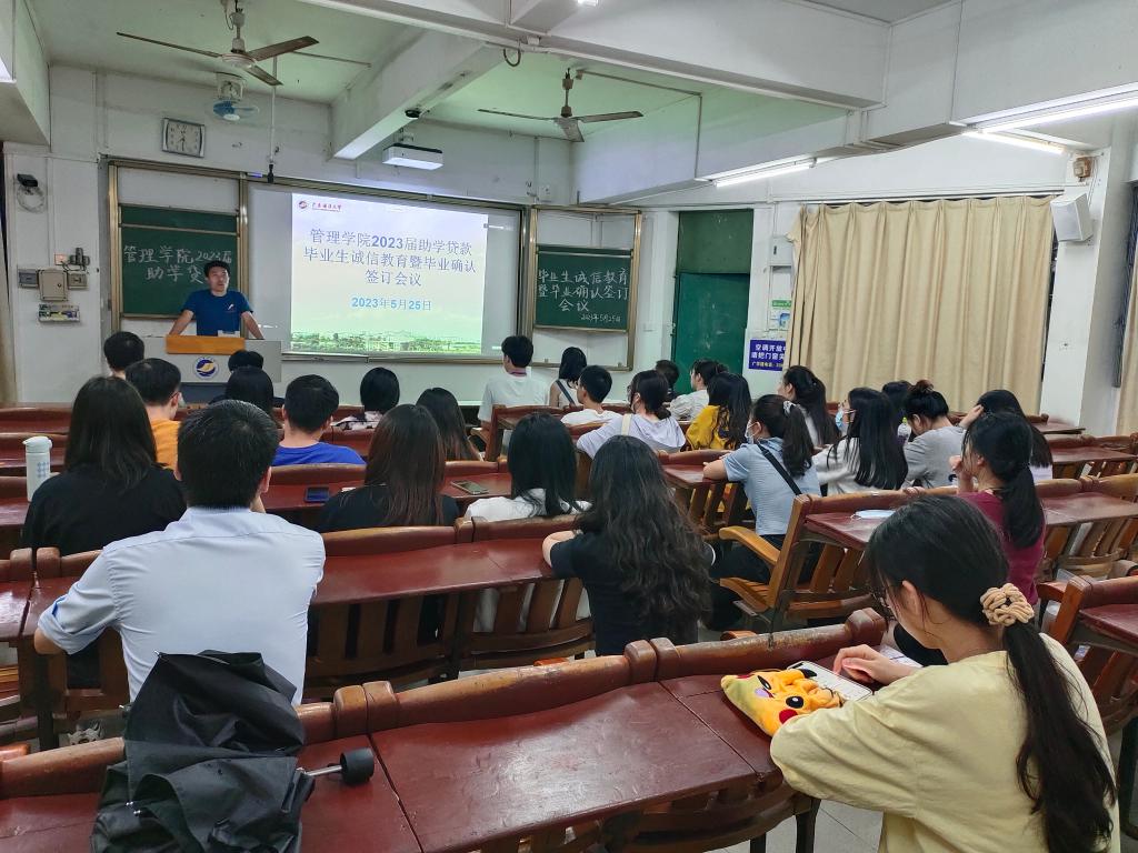 会上,黄伟庆向助学贷款毕业生讲解贷款有关政策、贷款人责任和义务等知识,并通过实例,说明违约将会导致对个人严重的不良结果,希望贷款同学们坚守贷款合同相关规定,准时还贷。黄伟庆还向毕业生讲解国家各类资助的政策,以及国家对大学生资助的初衷。希望贷款同学们对社会,对国家对母校心存感恩,鼓励同学们在助学贷款帮助下,认真学习,积极上进,为自己的未来,为国家的建设做努力。随后,会议组织全部贷款毕业生签订毕业确认表,并对相关同学的疑惑进行了答疑。