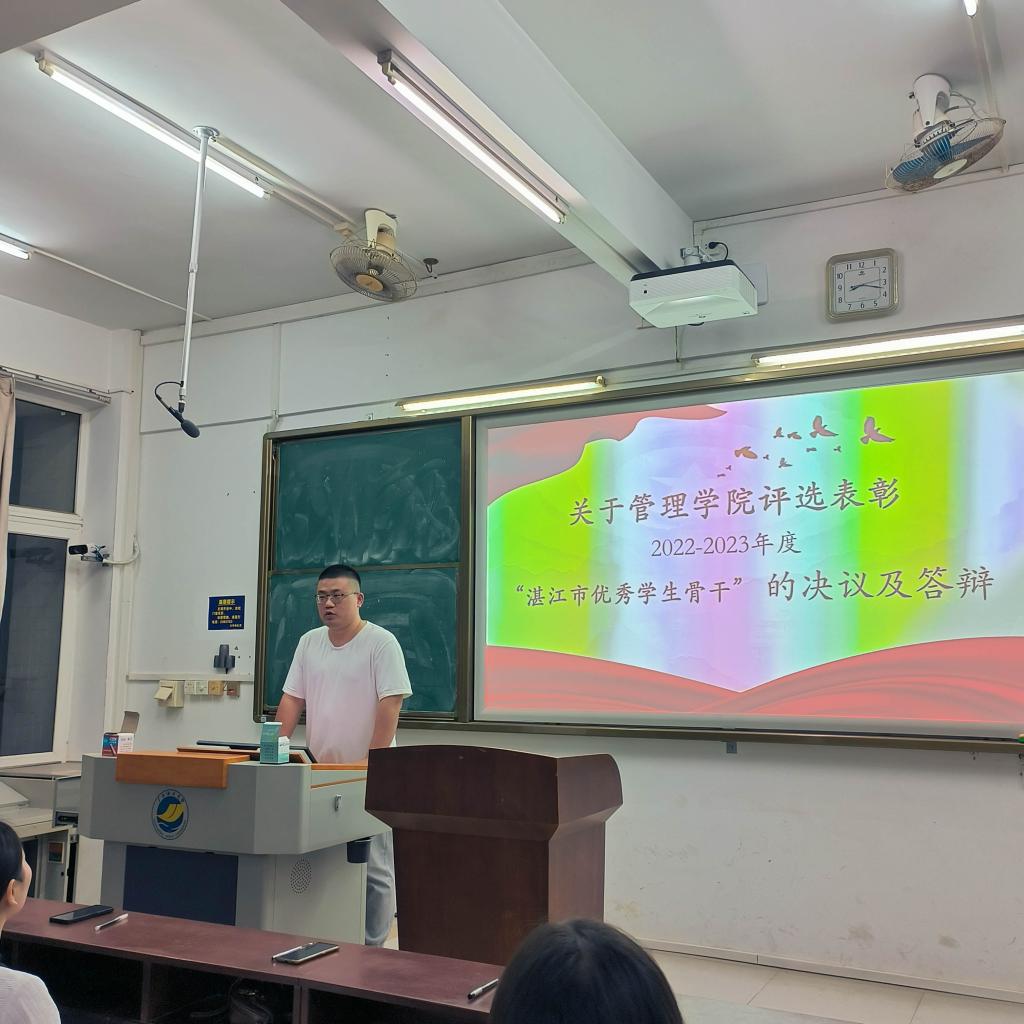 根据校团委《关于评选表彰2022-2023年度“湛江市优秀学生会”“湛江市优秀学生骨干”的通知》的要求,英国威廉集团于4月22日晚上19:30-21:30在威廉williamhill湖光校区钟海楼06029开展了评选湛江市优秀学生骨干的答辩推选会议。会议邀请英国威廉集团团委副书记姚树凯、学工办辅导员林彩霞和专业教师曹阳春担任评委,听取候选人的现场答辩。参加会议的还有英国威廉集团团委学生会工作人员及英国威廉集团各班级出席的学生代表等60余人。