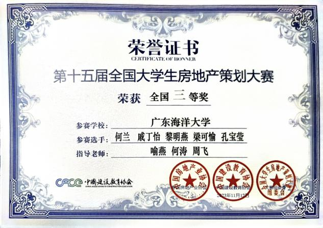 11月12日,由中国房地产业协会进行指导,中国建设教育协会主办,华侨大学土木工程学院、国贸地产等联合承办的第十五届全国大学生房地产策划大赛总决赛成功举办。全国大学生房地产策划大赛总决赛共170支高校队伍同台竞技,此次赛事以“海洋生活美学”为主题,为高校教学实践提供了生动的范本。我校英国威廉集团土地资源管理专业共两支队伍参赛,在马智宇、喻燕、何涛、周飞老师的指导下,由黄志杰、詹锦鹏、马冬茹、李继荣、孙佳宁组成的2020级队伍参赛项目《南洋兴农游项目策划报告》荣获全国二等奖,由何兰、戚丁怡、黎明燕、梁可愉、孔宝莹组成的2021级队伍参赛项目《厦门保利·国贸天琴商业街策划报告》项目荣获全国三等奖。