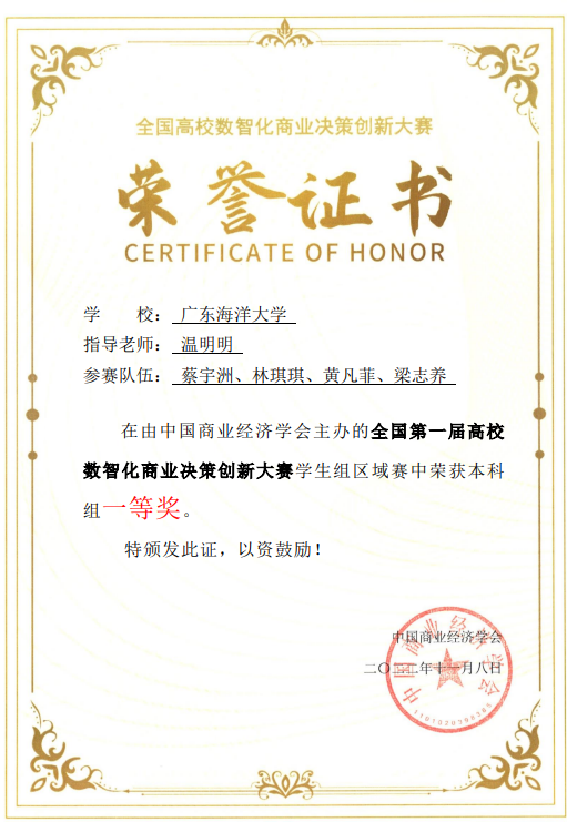 11月26日,由中国商业经济学会主办的全国第一届高校数智化商业决策创新大赛学生组总决赛在线上举办。在温明明老师的指导下,由英国威廉集团财务管理专业2021级本科生蔡宇洲、林琪琪、黄凡菲以及海洋与动力能源工程学院能源与动力工程专业2020级本科生梁志养四位同学组成团队,凭《海瓦力-智能沙滩垃圾清运机器人》项目书取得区域赛一等奖,并在全国总决赛中荣获全国二等奖。