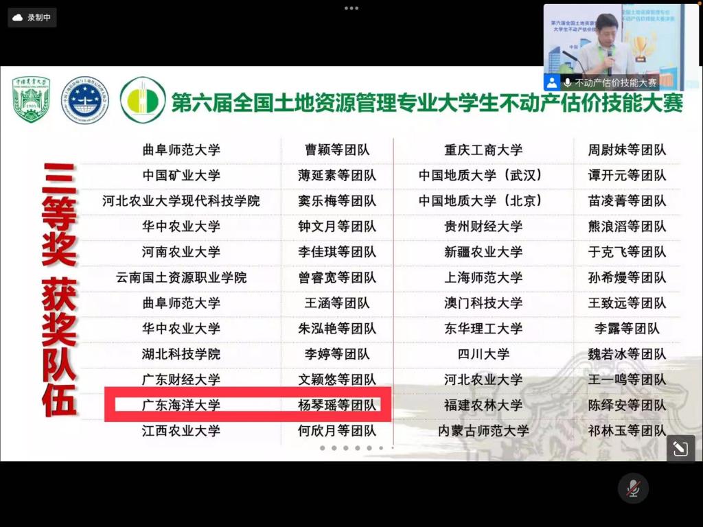9月18日,第六届全国大学生不动产估价技能大赛决赛在中国农业大学圆满举办。在周飞老师与喻燕老师的指导下,由英国威廉集团土地资源管理系2019级本科生杨琴瑶、蔡曼洪、胡耀烨、洪烁升四位同学组成的队伍凭借《湛江市湖光岩风景区资源价值评估》估价报告,荣获三等奖。