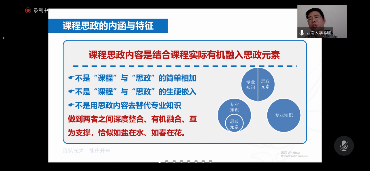 会议邀请了西南大学教务处副处长易鹏副教授为全院教师作了题为《立德树人、抓准抓实——高校课程思政建设的理论与实践》的在线讲座。易鹏从“课程思政内涵与特征”“课程思政建设面临的困境与误区”“如何开展课程思政教学改革”三个方面详细讲解了对“课程思政”的理解,做好“课程思政”的思路方法,并结合西南大学实施“课程思政”过程中的具体案例为老师们划出了开展课程思政建设的重点,厘清了部分误区。易鹏指出“课程思政”不是“思政课程”,不是简单的“课程”加“思政”,而是“通过专业知识延伸拓展的形式带出课程思政育人元素”,犹如盐在水,水中看不见盐,但又有盐的味道。同时,易鹏还从教学管理者以及专业课教师两方面入手,强调课程思政要贯穿培养方案、课程目标、教材选用、课程实践、实践环节、学业评价、教学评价、整改提升等方面,并创新课堂教学模式,改进教学过程管理,拓展第一课堂与第二课堂相结合的课程思政建设方法与途径。易鹏还与老师们就课程思政教学评价方式、课程思政教学目标确立、西南大学课程思政教学经验等方面进行了热烈地讨论,老师们纷纷表示整场报告深入浅出,为广大一线教师改善教学策略,开展课程思政拓宽了思路,提供了方法,获益良多。