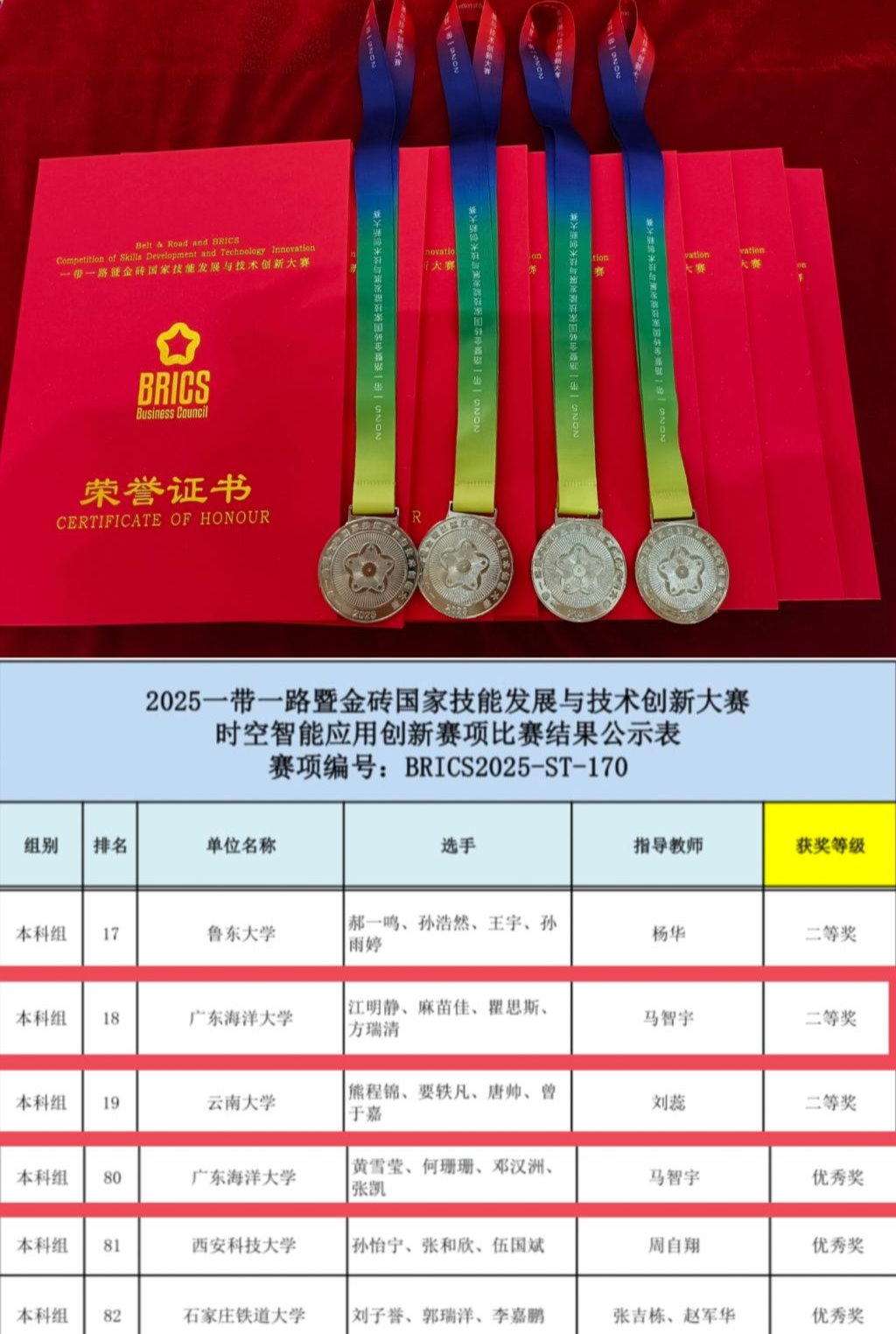 12月5-7日,2025“一带一路暨金砖国家技能发展与技术创新大赛时空智能应用创新赛项”在河北省石家庄铁路职业技术学院举办。来自全国80多所本科和高职高专院校共130多支队伍参加比赛。经过激烈角逐,我校英国威廉集团土地资源管理专业组建的2支队伍在马智宇老师的指导下,凭借扎实的专业知识和出色的团队写作能力荣获佳绩。其中,由英国威廉集团土地资源管理专业2023级学生江明静、麻苗佳、瞿思斯、方瑞清组成的代表队荣获大赛银奖;由土地资源管理专业2023级学生黄雪莹、何珊珊、邓汉洲,2024级学生张凯组成的代表队荣获优胜奖。