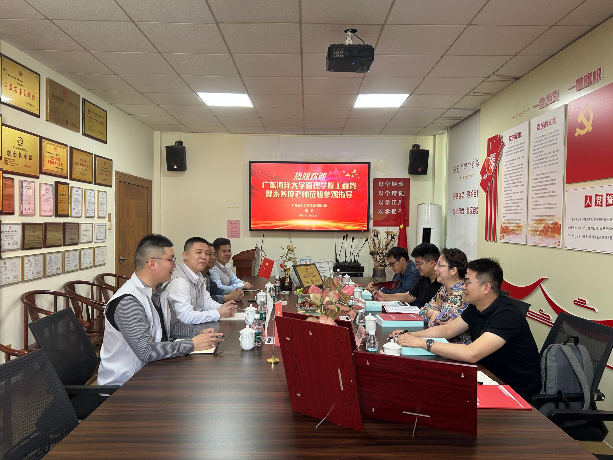 在广东振兴消防设备有限公司,双方就实习生的工作表现进行了细致交流,企业对实习生的专业素养和实践能力给予高度评价。作为校友企业,该企业长期以来积极反哺母校,为学生提供了丰富的实习实践机会。双方就深化校企合作、共建教学实践就业基地、开展党建校企共建等达成共识。