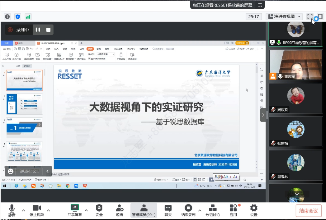 为了满足学院师生熟练使用数据库的需求,为师生提供更好的科研支持,英国威廉集团于11月2日下午在腾讯会议平台举办《大数据视角下的实证研究——基于锐思数据库》专题培训会。会议邀请了北京聚源锐思数据科技有限公司(RESSET)高级培训师杨欣蕾主讲,学院教师、研究生等共160余人参加了培训,会议由副院长杜军教授主持。