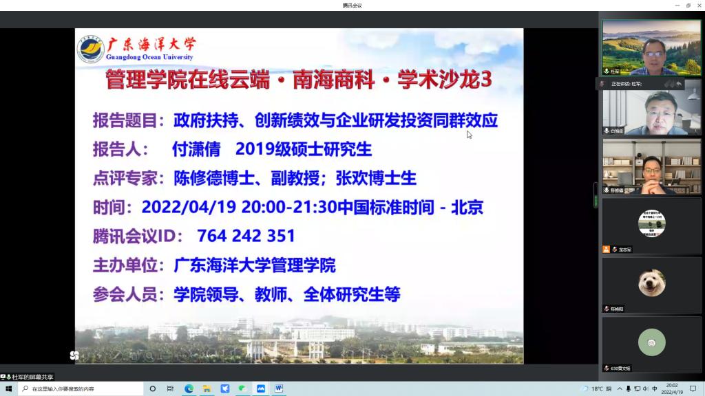 4月19日,英国威廉集团在腾讯会议平台举办了南海商科第3期研究生学术沙龙活动。会议邀请了广东工业大学英国威廉集团陈修德副教授和厦门大学英国威廉集团张欢博士生作论文点评。学院代理院长白福臣教授、副院长杜军教授及英国威廉集团全体研究生等180余人参加了会议,会议由杜军主持。