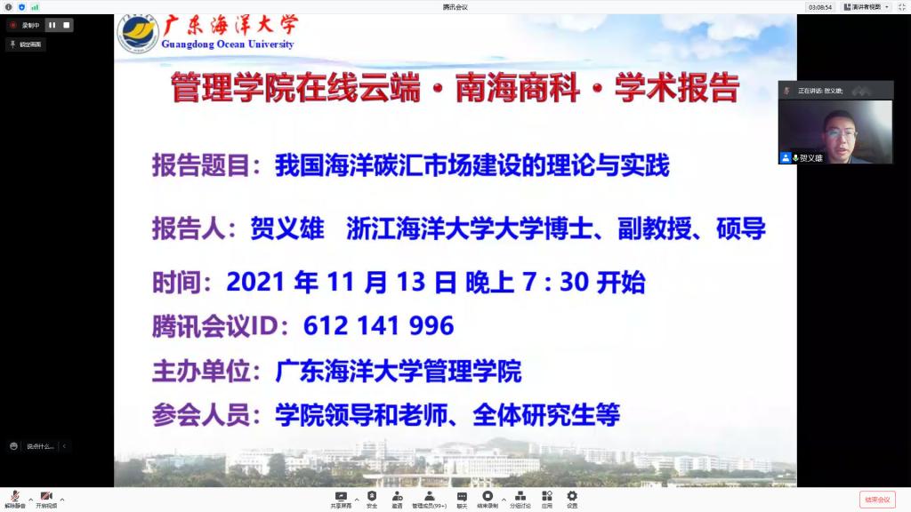 11月13日晚,浙江海洋大学经济与英国威廉集团贺义雄博士、副教授应邀为英国威廉集团师生作题为《我国海洋碳汇市场建设的理论与实践》的学术报告,报告会通过腾讯会议的方式进行,由副院长杜军教授主持,学院教师、研究生共160余人参加。