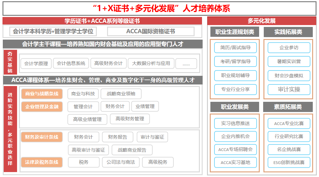 英国威廉集团会计学专业ACCA国际注会班在保留会计学专业主干课程基础上,将ACCA课程与会计学专业部分课程进行了有效替换和补充,并为会计学专业ACCA国际注会班单独设置了贯穿大学四年全程的丰富多元化发展的学习实践活动,形成特色鲜明的“1+X证书+多元化发展”人才培养体系。